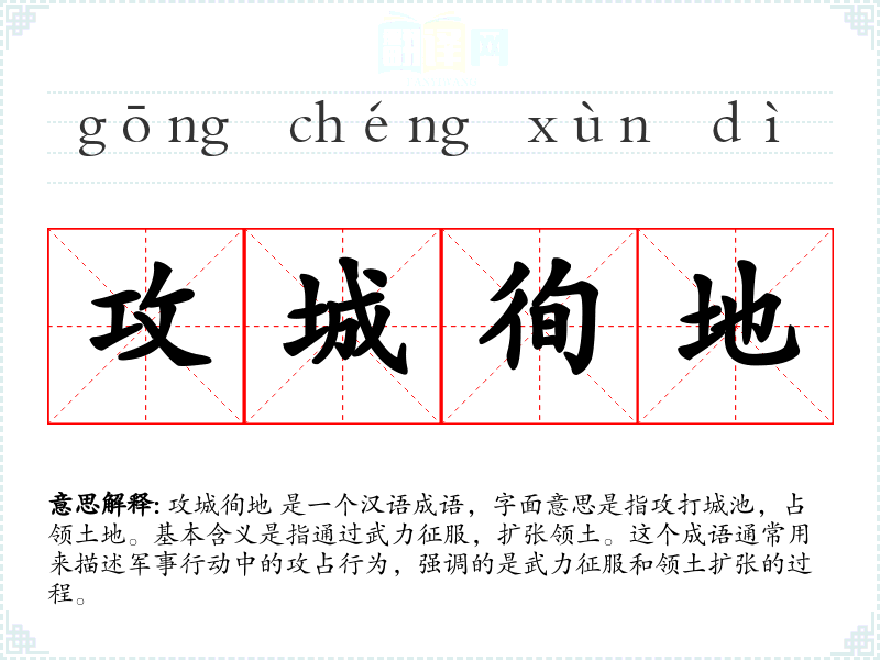攻城徇地 是一个汉语成语,字面意思是指攻打城池,占领土地。基本含义是指通过武力征服,扩张领土。这个成语通常用来描述军事行动中的攻占行为,强调的是武力征服和领土扩张的过程。