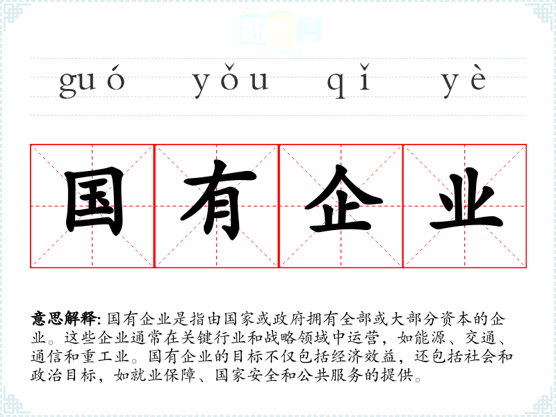 “国有企业”是一个复杂且多维的词汇,它不仅涉及经济和商业活动,还涉及政治、社会和文化层面。理解和分析这一词汇,有助于我们更全面地认识国家经济结构和社会发展。在语言学*和表达中,掌握这一词汇的丰富内涵和用法,对于提升语言能力和深化对特定社会现象的理解至关重要。