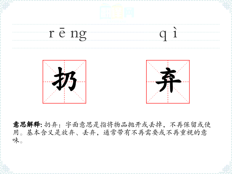 扔弃:字面意思是指将物品抛开或丢掉,不再保留或使用。基本含义是放弃、丢弃,通常带有不再需要或不再重视的意味。