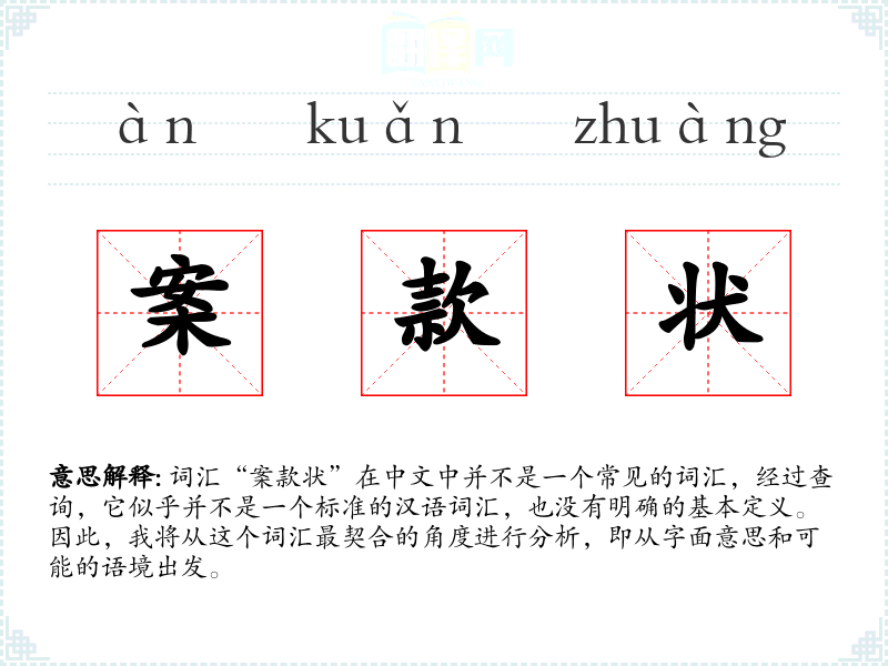 词汇“案款状”在中文中并不是一个常见的词汇,经过查询,它似乎并不是一个标准的汉语词汇,也没有明确的基本定义。因此,我将从这个词汇最契合的角度进行分析,即从字面意思和可能的语境出发。