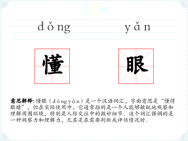 懂眼(dǒng yǎn)是一个汉语词汇,字面意思是“懂得眼睛”,但在实际使用中,它通常指的是一个人能够敏锐地观察和理解周围环境,特别是人际交往中的微妙细节。这个词汇强调的是一种洞察力和理解力,尤其是在需要判断或评估情况时。