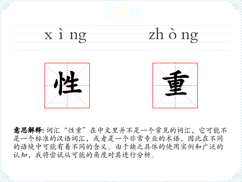 由于“性重”不是一个标准词汇,我们无法给出一个确切的字面意思和基本含义。它可能是由“性”和“重”两个字组合而成的,其中“性”可以指性质、性格、性别等,而“重”可以指重要、重量、重视等。因此,“性重”可能指的是某种性质或性格上的重要性,或者是对某种性质或性格的重视。