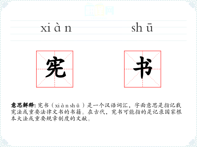 宪书(xiàn shū)是一个汉语词汇,字面意思是指记载宪法或重要法律文书的书籍。在古代,宪书可能指的是记录国家根本大法或重要规章制度的文献。