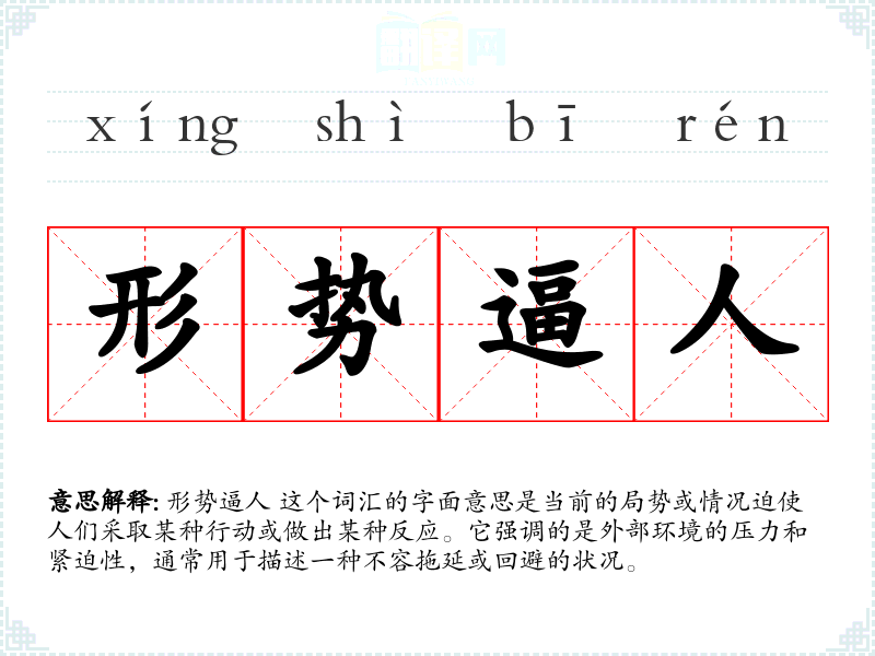 “形势逼人”这个词汇源于汉语,其中“形势”指的是外在的环境或状况,“逼人”则意味着迫使或催促。这个词汇在现代汉语中广泛使用,特别是在描述紧急或关键的时刻。