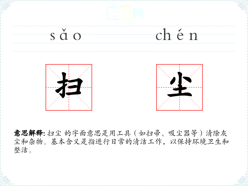 扫尘 的字面意思是用工具(如扫帚、吸尘器等)清除灰尘和杂物。基本含义是指进行日常的清洁工作,以保持环境卫生和整洁。