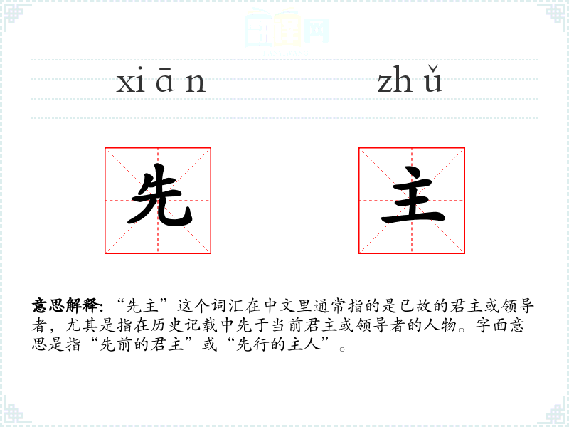 “先主”这个词汇在中文里通常指的是已故的君主或领导者,尤其是指在历史记载中先于当前君主或领导者的人物。字面意思是指“先前的君主”或“先行的主人”。