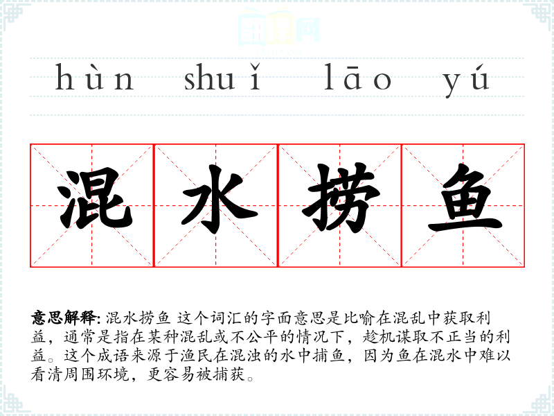 混水捞鱼 这个词汇的字面意思是比喻在混乱中获取利益,通常是指在某种混乱或不公平的情况下,趁机谋取不正当的利益。这个成语来源于渔民在混浊的水中捕鱼,因为鱼在混水中难以看清周围环境,更容易被捕获。