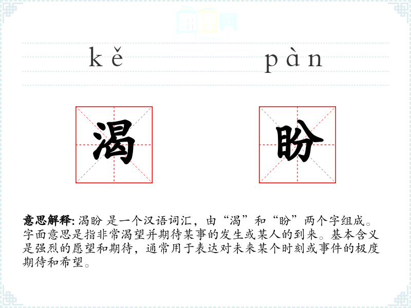 渴盼 的词源较为直接,由“渴”(渴望)和“盼”(期待)两个字组成。在汉语中,这两个字都有悠久的历史,组合在一起形成了一个表达强烈期待的词汇。