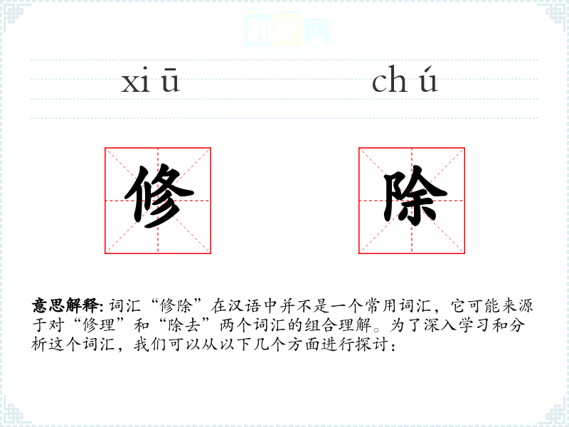 “修除”字面意思可以理解为“修理并除去”,即在进行修理的同时,去除不需要的部分或瑕疵。