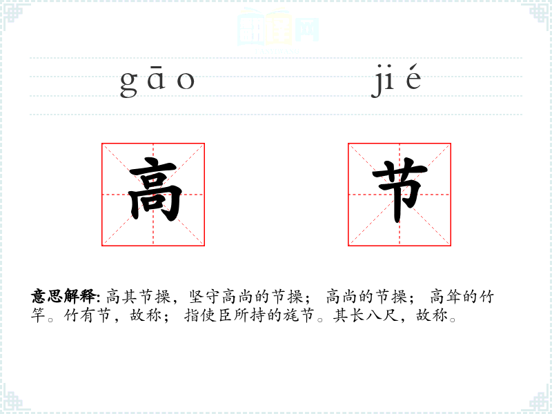 高其节操,坚守高尚的节操; 高尚的节操; 高耸的竹竿。竹有节,故称; 指使臣所持的旄节。其长八尺,故称。