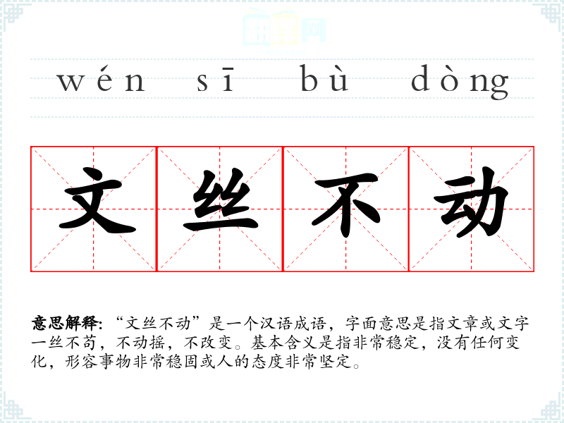 “文丝不动”是一个汉语成语,字面意思是指文章或文字一丝不苟,不动摇,不改变。基本含义是指非常稳定,没有任何变化,形容事物非常稳固或人的态度非常坚定。