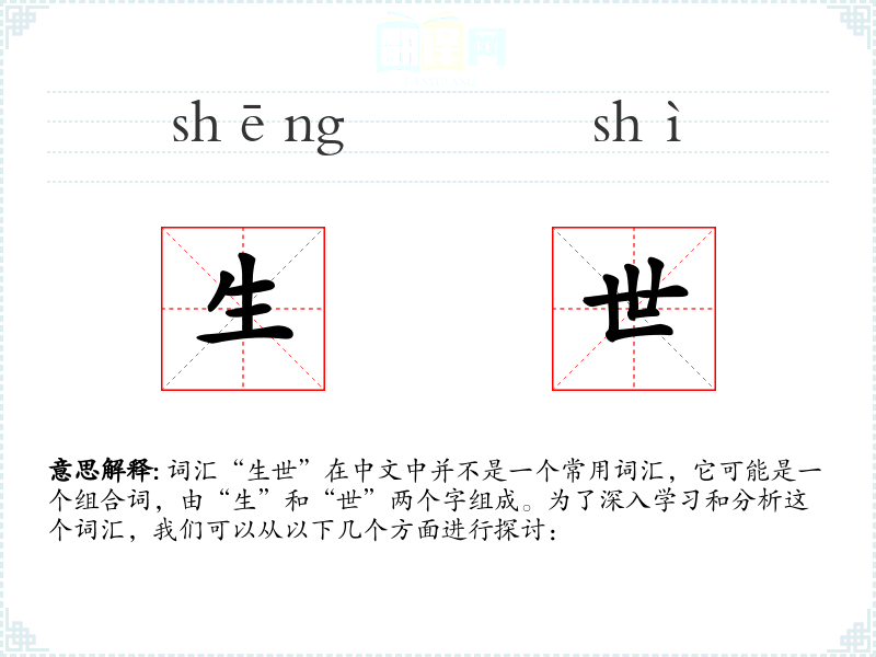 词汇“生世”在中文中并不是一个常用词汇,它可能是一个组合词,由“生”和“世”两个字组成。为了深入学*和分析这个词汇,我们可以从以下几个方面进行探讨: