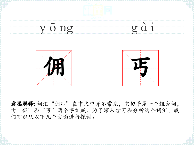 词汇“佣丐”在中文中并不常见,它似乎是一个组合词,由“佣”和“丐”两个字组成。为了深入学*和分析这个词汇,我们可以从以下几个方面进行探讨: