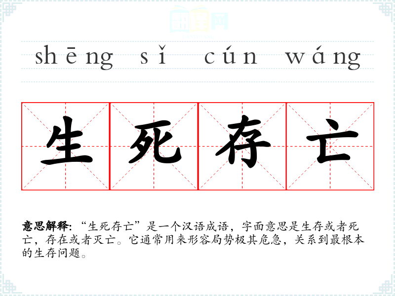 “生死存亡”是一个汉语成语,字面意思是生存或者死亡,存在或者灭亡。它通常用来形容局势极其危急,关系到最根本的生存问题。