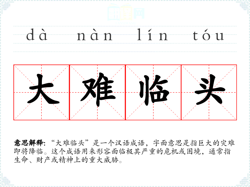 “大难临头”是一个汉语成语,字面意思是指巨大的灾难即将降临。这个成语用来形容面临极其严重的危机或困境,通常指生命、财产或精神上的重大威胁。