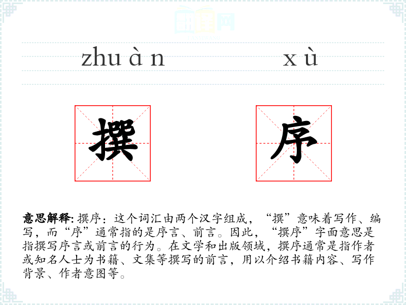 撰序:这个词汇由两个汉字组成,“撰”意味着写作、编写,而“序”通常指的是序言、前言。因此,“撰序”字面意思是指撰写序言或前言的行为。在文学和出版领域,撰序通常是指作者或知名人士为书籍、文集等撰写的前言,用以介绍书籍内容、写作背景、作者意图等。