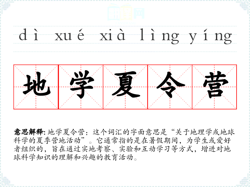 地学夏令营:这个词汇的字面意思是“关于地理学或地球科学的夏季营地活动”。它通常指的是在暑假期间,为学生或爱好者组织的,旨在通过实地考察、实验和互动学习等方式,增进对地球科学知识的理解和兴趣的教育活动。