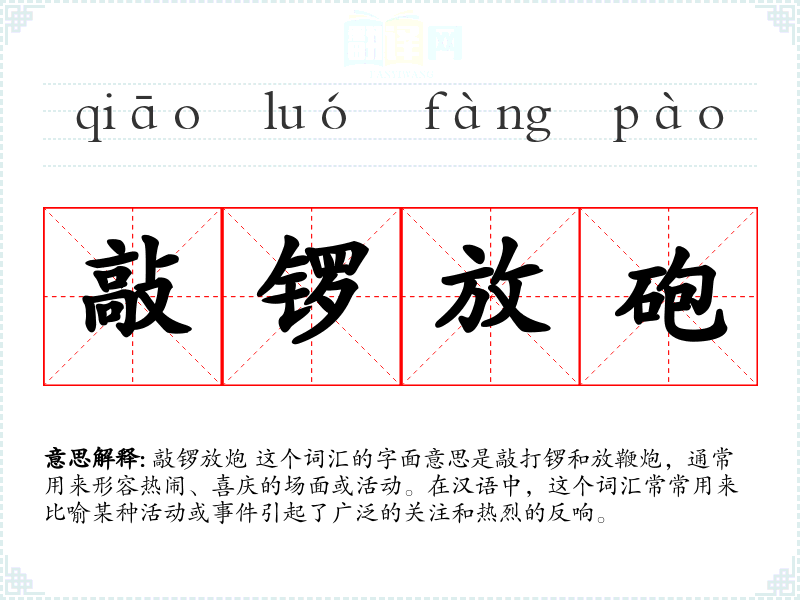 敲锣放炮 这个词汇的字面意思是敲打锣和放鞭炮,通常用来形容热闹、喜庆的场面或活动。在汉语中,这个词汇常常用来比喻某种活动或**引起了广泛的关注和热烈的反响。
