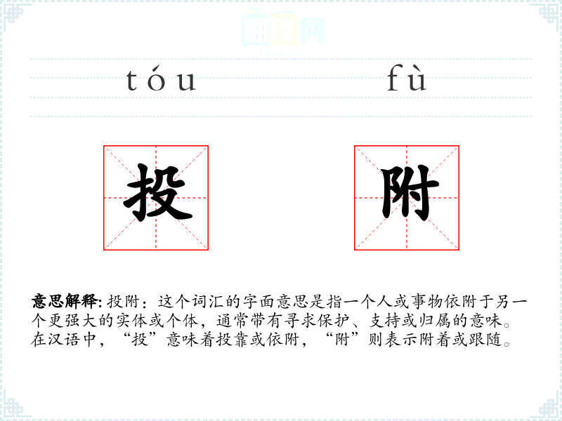 投附:这个词汇的字面意思是指一个人或事物依附于另一个更强大的实体或个体,通常带有寻求保护、支持或归属的意味。在汉语中,“投”意味着投靠或依附,“附”则表示附着或跟随。
