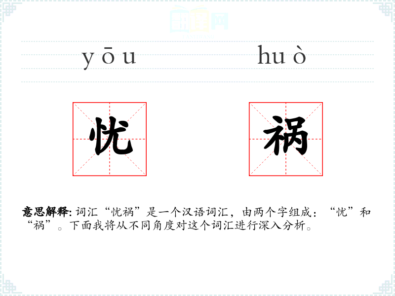 “忧”字古已有之,表示忧愁、忧虑;“祸”字则指灾难、不幸。两个字组合在一起,形成了“忧祸”这个词汇,用以强调对不幸的预感和担忧。