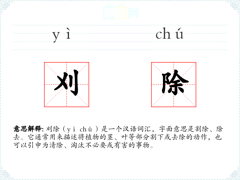 刈除(yì chú)是一个汉语词汇,字面意思是割除、除去。它通常用来描述将植物的茎、叶等部分割下或去除的动作,也可以引申为清除、淘汰不必要或有害的事物。