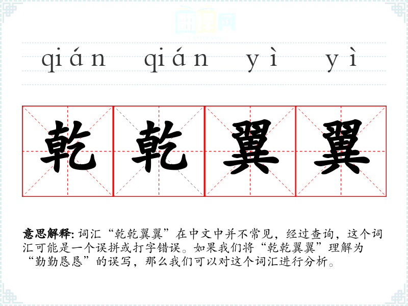 词汇“乾乾翼翼”在中文中并不常见,经过查询,这个词汇可能是一个误拼或打字错误。如果我们将“乾乾翼翼”理解为“勤勤恳恳”的误写,那么我们可以对这个词汇进行分析。