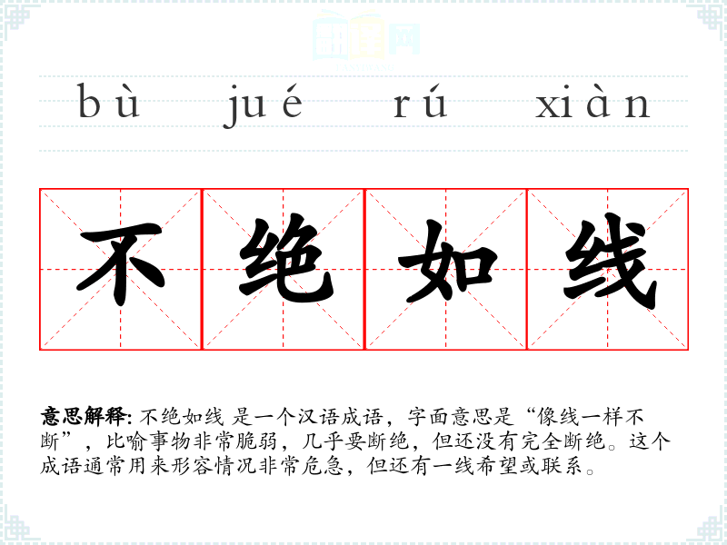 不绝如线 是一个汉语成语,字面意思是“像线一样不断”,比喻事物非常脆弱,几乎要断绝,但还没有完全断绝。这个成语通常用来形容情况非常危急,但还有一线希望或联系。