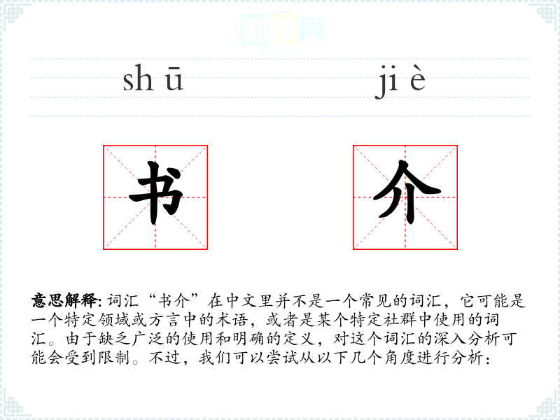 由于“书介”不是一个标准词汇,我们无法给出一个确切的基本定义。它可能是指“书籍介绍”的缩写,或者是某个特定领域中的术语。