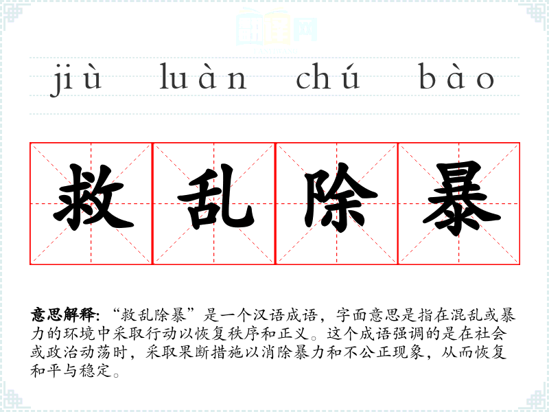 “救乱除暴”是一个汉语成语,字面意思是指在混乱或暴力的环境中采取行动以恢复秩序和正义。这个成语强调的是在社会或政治动荡时,采取果断措施以消除暴力和不公正现象,从而恢复和平与稳定。