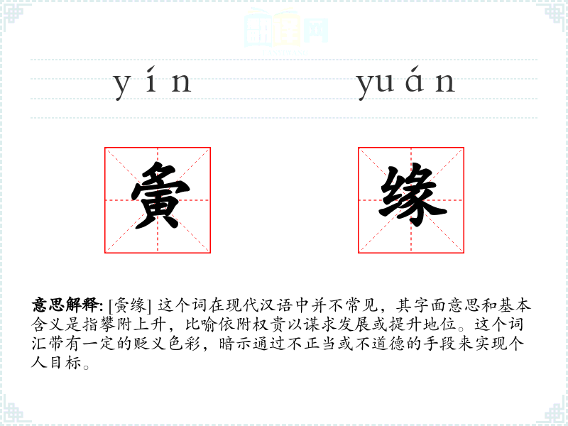 [夤缘] 这个词在现代汉语中并不常见,其字面意思和基本含义是指攀附上升,比喻依附权贵以谋求发展或提升地位。这个词汇带有一定的贬义色彩,暗示通过不正当或不道德的手段来实现个人目标。