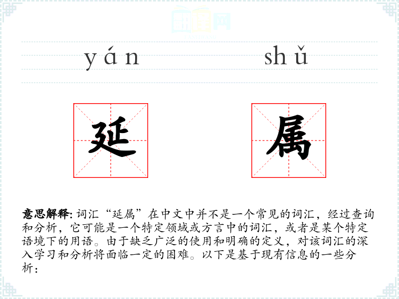 综上所述,词汇“延属”可能是一个特定领域或方言中的词汇,由于缺乏广泛的使用和明确的定义,对其进行深入学习和分析存在一定的困难。如果能够获得更多关于该词汇的背景信息和使用语境,我们或许能够提供更详细的分析。