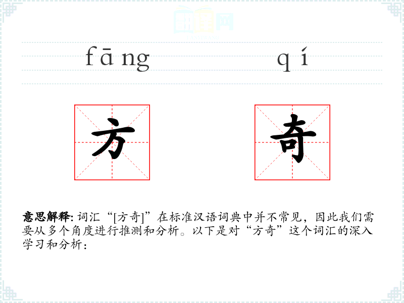 词汇“[方奇]”在标准汉语词典中并不常见,因此我们需要从多个角度进行推测和分析。以下是对“方奇”这个词汇的深入学习和分析:
