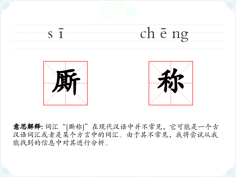 词汇“[厮称]”在现代汉语中并不常见,它可能是一个古汉语词汇或者是某个方言中的词汇。由于其不常见,我将尝试从我能找到的信息中对其进行分析。