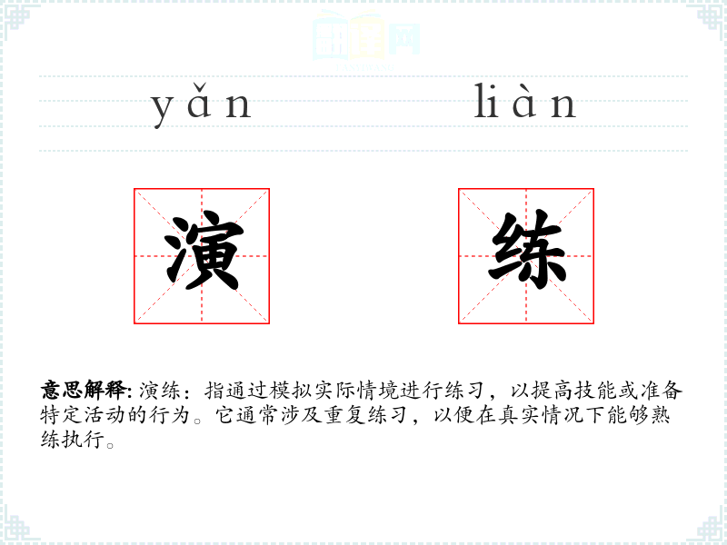 演练:指通过模拟实际情境进行练,以提高技能或准备特定活动的行为。它通常涉及重复练,以便在真实情况下能够熟练执行。