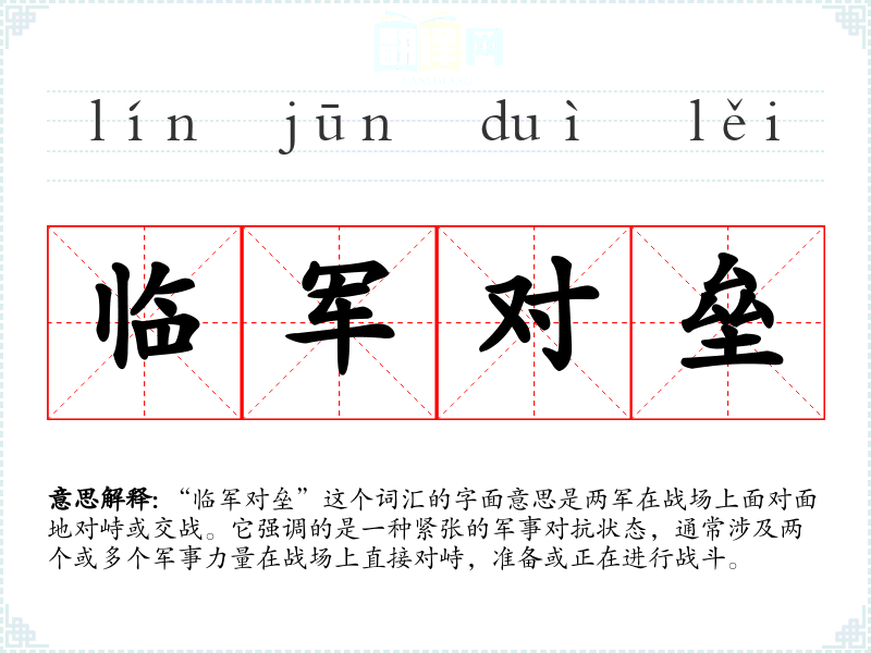 “临军对垒”这个词汇的字面意思是两军在战场上面对面地对峙或交战。它强调的是一种紧张的军事对抗状态,通常涉及两个或多个军事力量在战场上直接对峙,准备或正在进行战斗。