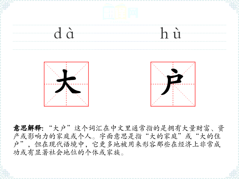 “大户”这个词汇在中文里通常指的是拥有大量财富、资产或影响力的家庭或个人。字面意思是指“大的家庭”或“大的住户”,但在现代语境中,它更多地被用来形容那些在经济上非常成功或有显著社会地位的个体或家族。