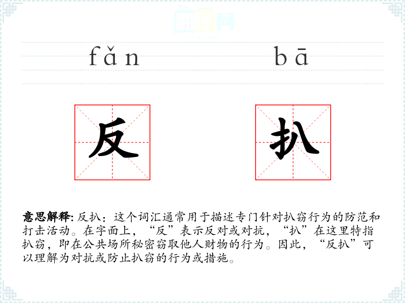反扒:这个词汇通常用于描述专门针对扒窃行为的防范和打击活动。在字面上,“反”表示反对或对抗,“扒”在这里特指扒窃,即在公共场所秘密窃取他人财物的行为。因此,“反扒”可以理解为对抗或防止扒窃的行为或措施。