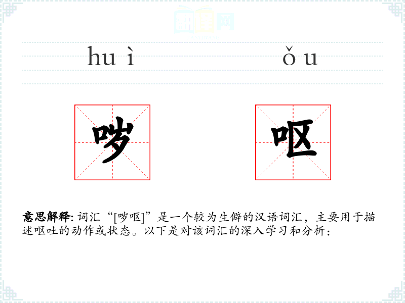 词汇“[哕呕]”是一个较为生僻的汉语词汇,主要用于描述呕吐的动作或状态。以下是对该词汇的深入学习和分析: