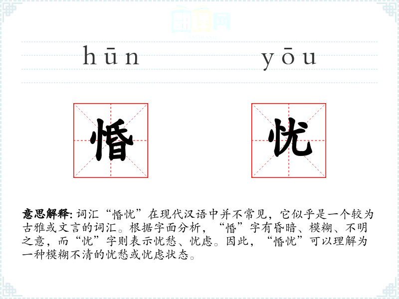 词汇“惛忧”在现代汉语中并不常见,它似乎是一个较为古雅或文言的词汇。根据字面分析,“惛”字有昏暗、模糊、不明之意,而“忧”字则表示忧愁、忧虑。因此,“惛忧”可以理解为一种模糊不清的忧愁或忧虑状态。