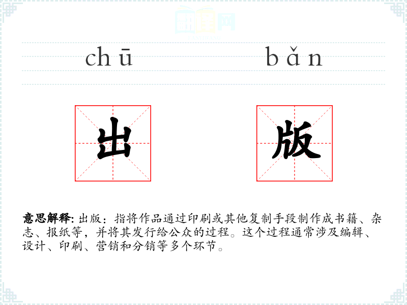 出版:指将作品通过印刷或其他复制手段制作成书籍、杂志、报纸等,并将其发行给公众的过程。这个过程通常涉及编辑、设计、印刷、营销和分销等多个环节。