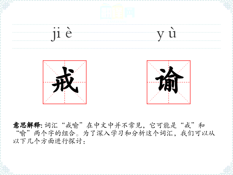 “戒”和“喻”都是古代汉语中的常用字,它们的组合可能是现代汉语中的一个创新用法,用于强调通过比喻或教导的方式进行警告或劝诫。