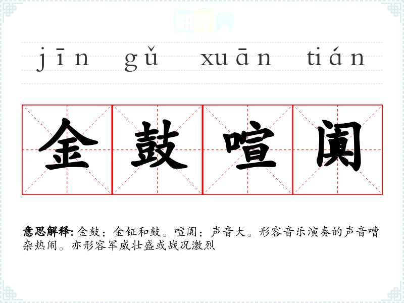 金鼓:金钲和鼓。喧阗:声音大。形容音乐演奏的声音嘈杂热闹。亦形容军威壮盛或战况激烈