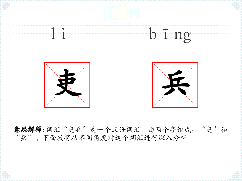 - “吏兵”这个词汇虽然不常用于现代汉语,但它承载了丰富的历史信息和文化内涵,对于理解古代*的行政和军事体系具有重要意义。在学汉语和了解**历史文化时,这个词汇是一个重要的知识点。