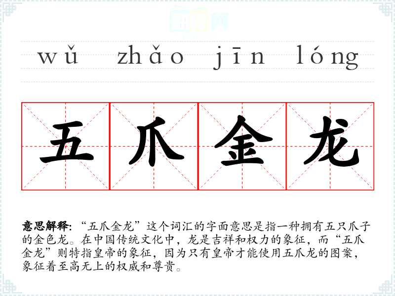 在文学中,“五爪金龙”常被用来形容皇家的气派和威严,如在描述皇宫或**的服饰时。在口语中,这个词汇可能被用来比喻某人或某组织的权威和地位。在专业领域,如历史学或艺术学,它可能被用来讨论特定的文化符号和象征意义。