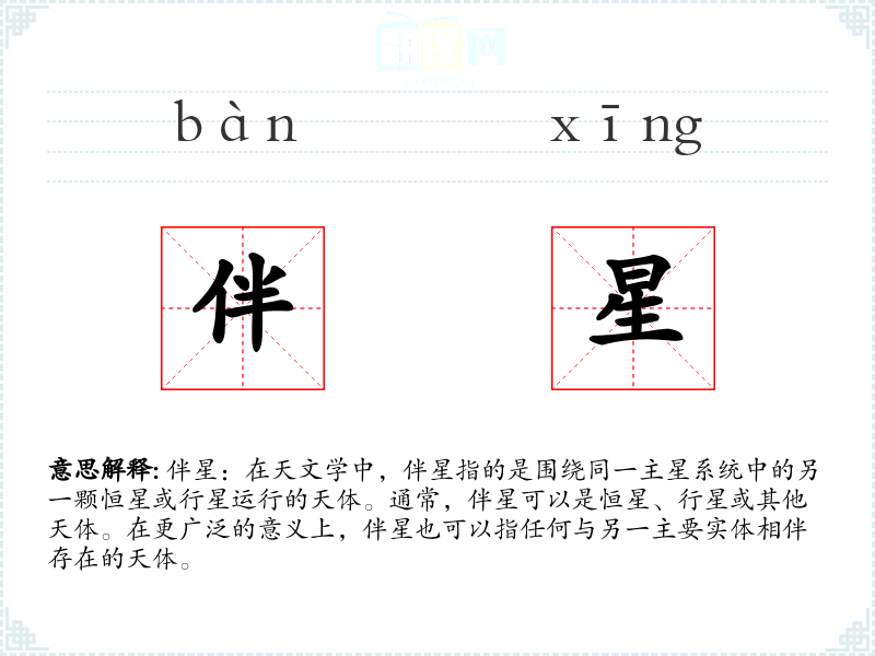 “伴星”一词源自天文学领域,由“伴”和“星”两个字组成。随着天文学的发展,这个词逐渐被用来描述特定的天体关系。在语言的演变中,它也偶尔被用于比喻意义,尤其是在文学和日常表达中。