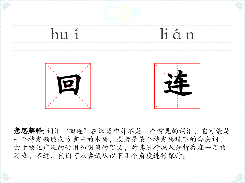 词汇“回连”在汉语中并不是一个常见的词汇,它可能是一个特定领域或方言中的术语,或者是某个特定语境下的合成词。由于缺乏广泛的使用和明确的定义,对其进行深入分析存在一定的困难。不过,我们可以尝试从以下几个角度进行探讨: