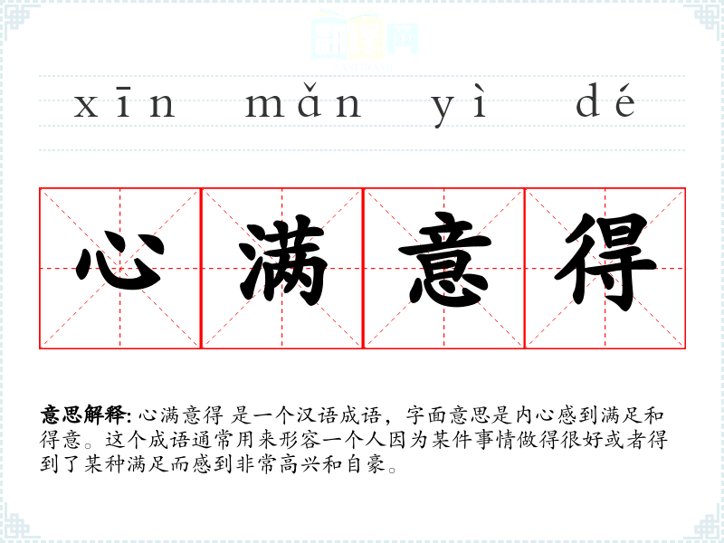 心满意得 是一个汉语成语,字面意思是内心感到满足和得意。这个成语通常用来形容一个人因为某件事情做得很好或者得到了某种满足而感到非常高兴和自豪。