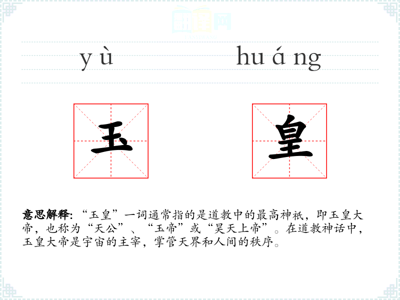 “玉皇”一词通常指的是道教中的最高神祇,即玉皇大帝,也称为“天公”、“玉帝”或“昊天上帝”。在道教神话中,玉皇大帝是宇宙的主宰,掌管天界和人间的秩序。