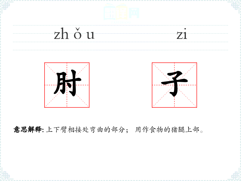 上下臂相接处弯曲的部分; 用作食物的猪腿上部。