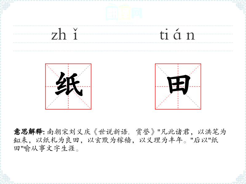 南朝宋刘义庆《世说新语.赏誉》"凡此诸君,以洪笔为鉯耒,以纸札为良田,以玄默为稼穑,以义理为丰年。"后以"纸田"喻从事文字生涯。